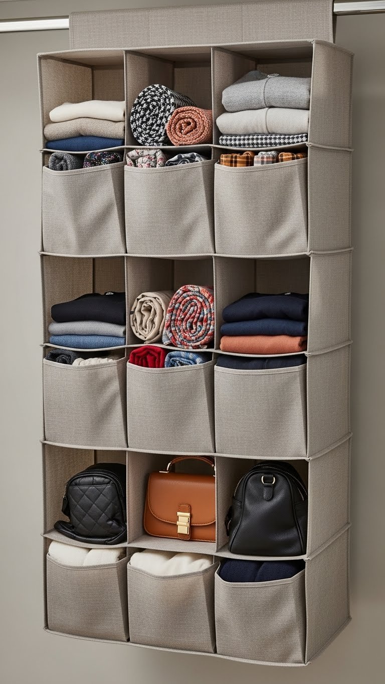 Mount a hanging organizer ($15–$40 from Amazon or Target) using hooks or a tension rod. Choose ones with 9–16 pockets for best use of space. This takes 10 minutes and works even in small reach-ins. Fill pockets with rolled items (takes up 30% less space than folded), and you’ve created vertical storage without eating shelf room. Renters can use command strips instead of nails.