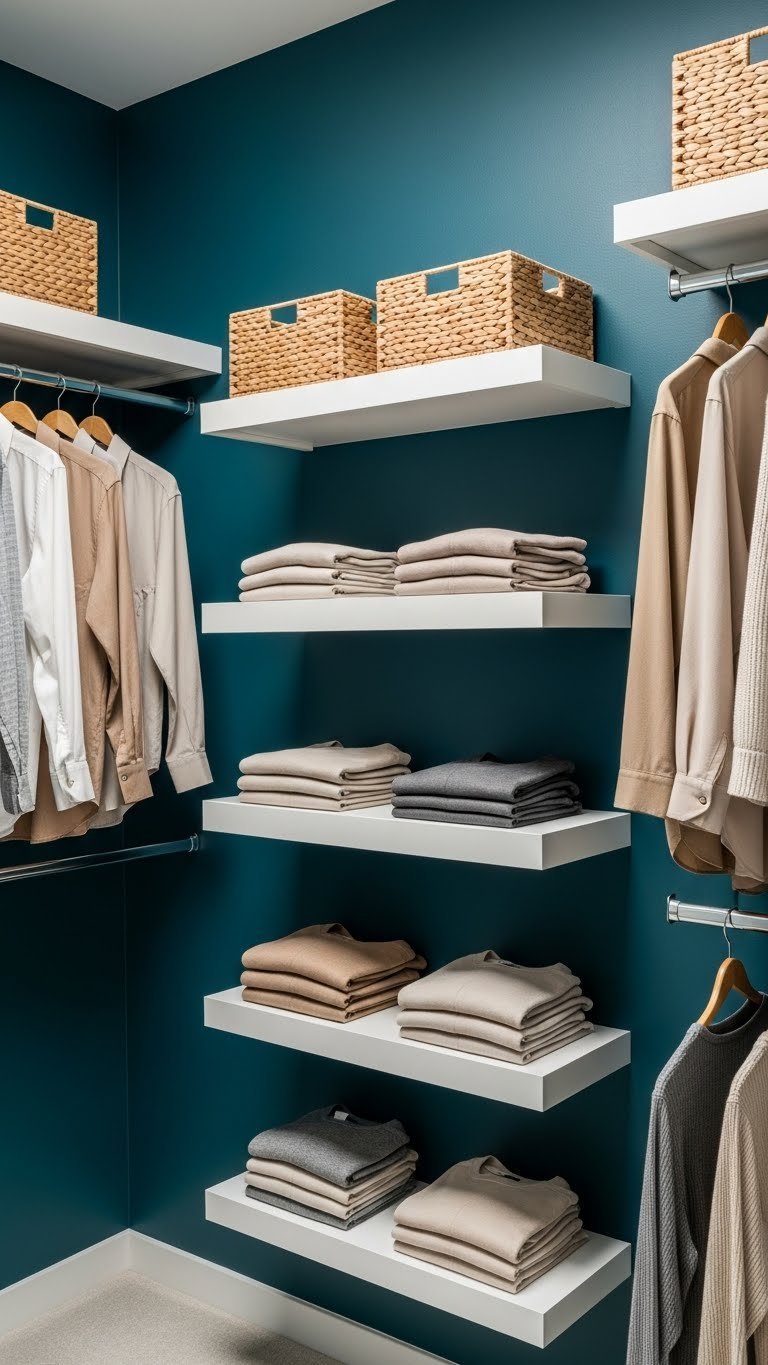 Floating shelves grab dead space you’re probably ignoring right now. By mounting shelves 12–18 inches above your existing rod, you create premium real estate for off-season items, accessories, or folded inventory.