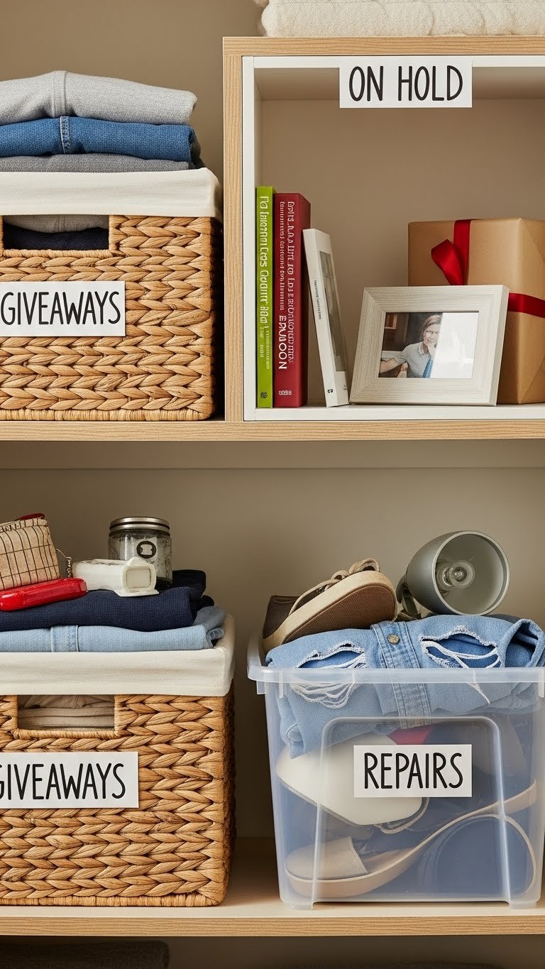 Assign one shelf (or half shelf) and place 2–3 labeled bins there ($10–$25 for bins and labels). Categories: “giveaway,” “repair,” “donate,” or “try on again.” Set a monthly review date and act on decisions—don’t let this bin become permanent storage. This costs almost nothing and takes 20 minutes to set up.