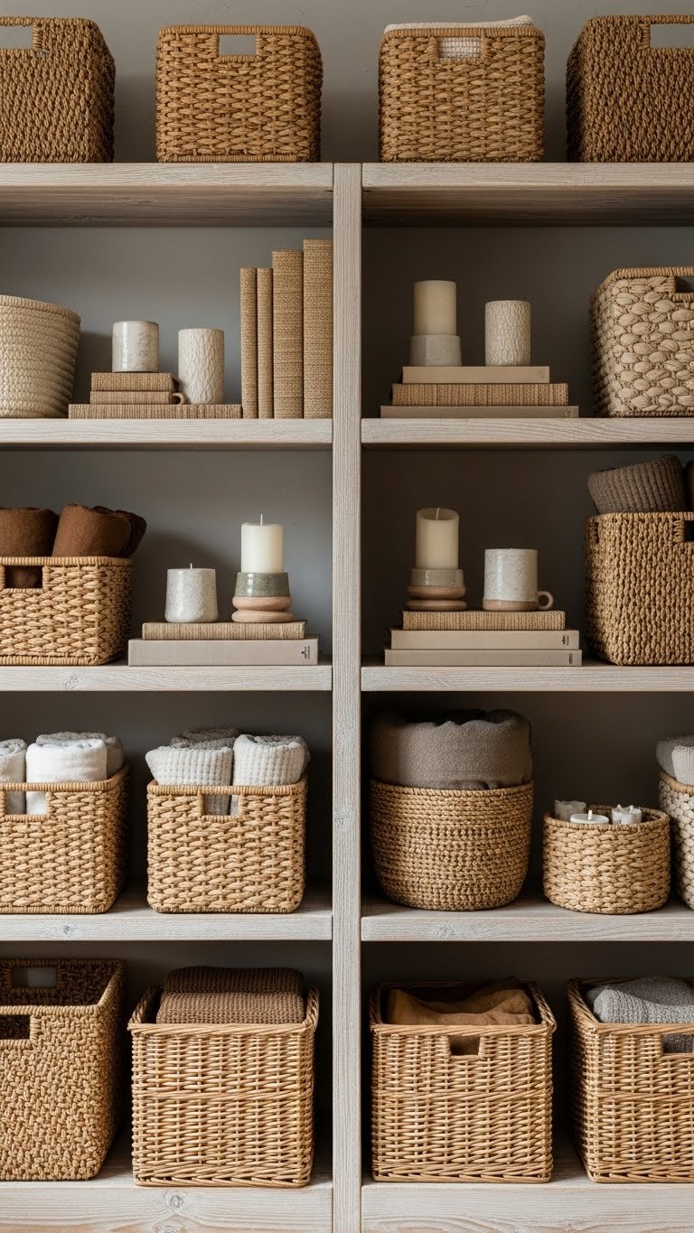 17. Use Woven Baskets to Soften Shelves and Hide Clutter