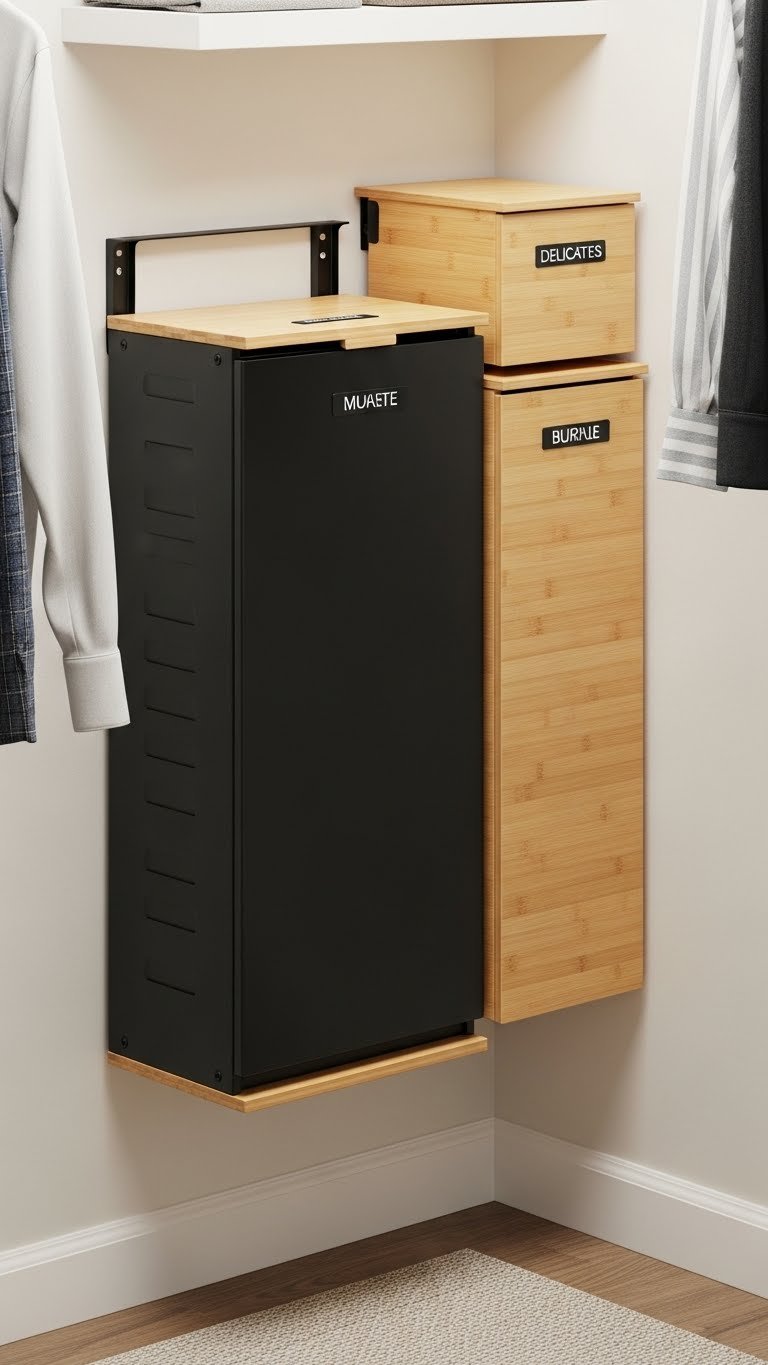 Install a wall-mounted hamper ($30–$80 from Wayfair, Amazon, or home goods stores) using brackets and a drill (15-minute job). Choose one with a removable mesh liner so laundry goes straight from bin to washer. Alternatively, use adhesive hooks ($1–$5) to hang a fabric hamper bag ($15–$30). Space it near your entry or far corner depending on your flow. Add a small bin beside it for delicates or items needing hand-wash.