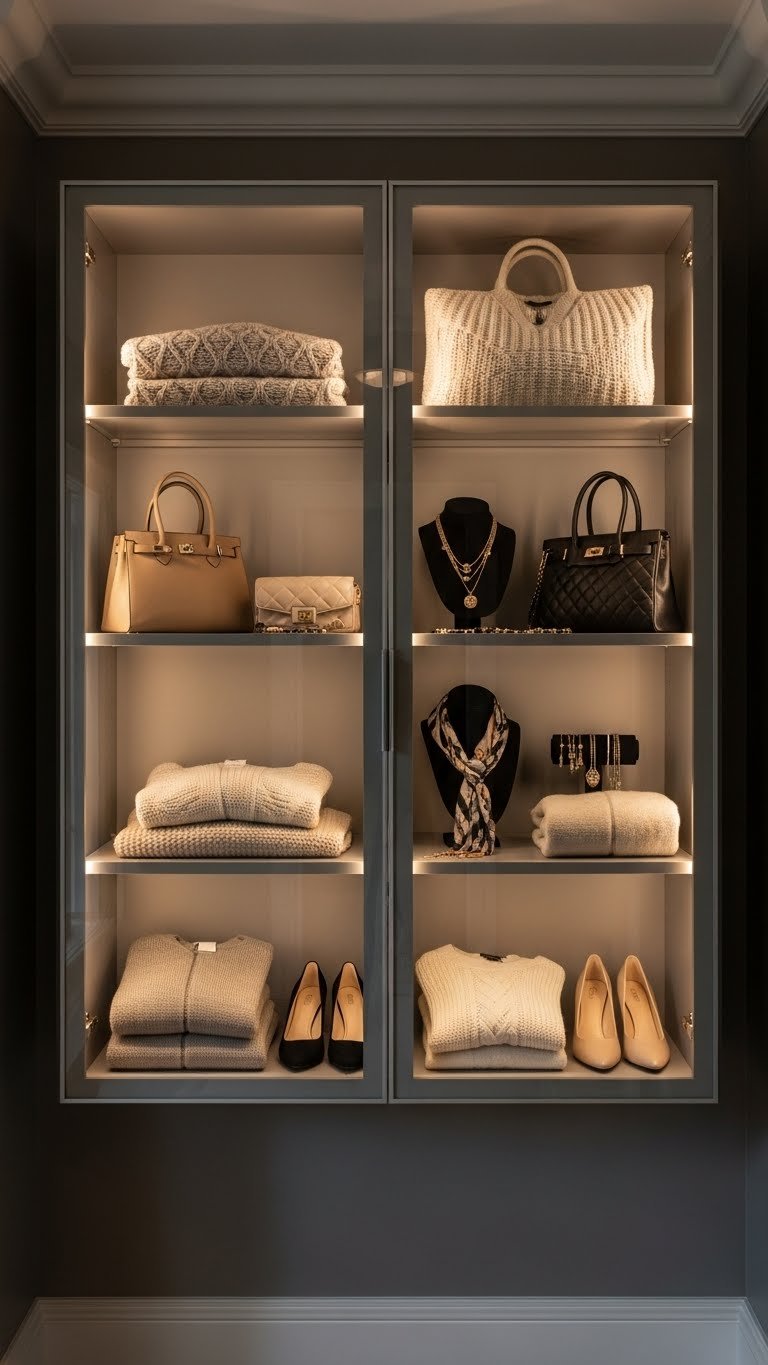 Glass-front cabinets let you display special pieces—designer bags, luxury knits, or jewelry—while keeping them dust-free. They make your closet feel more retail and less storage room.