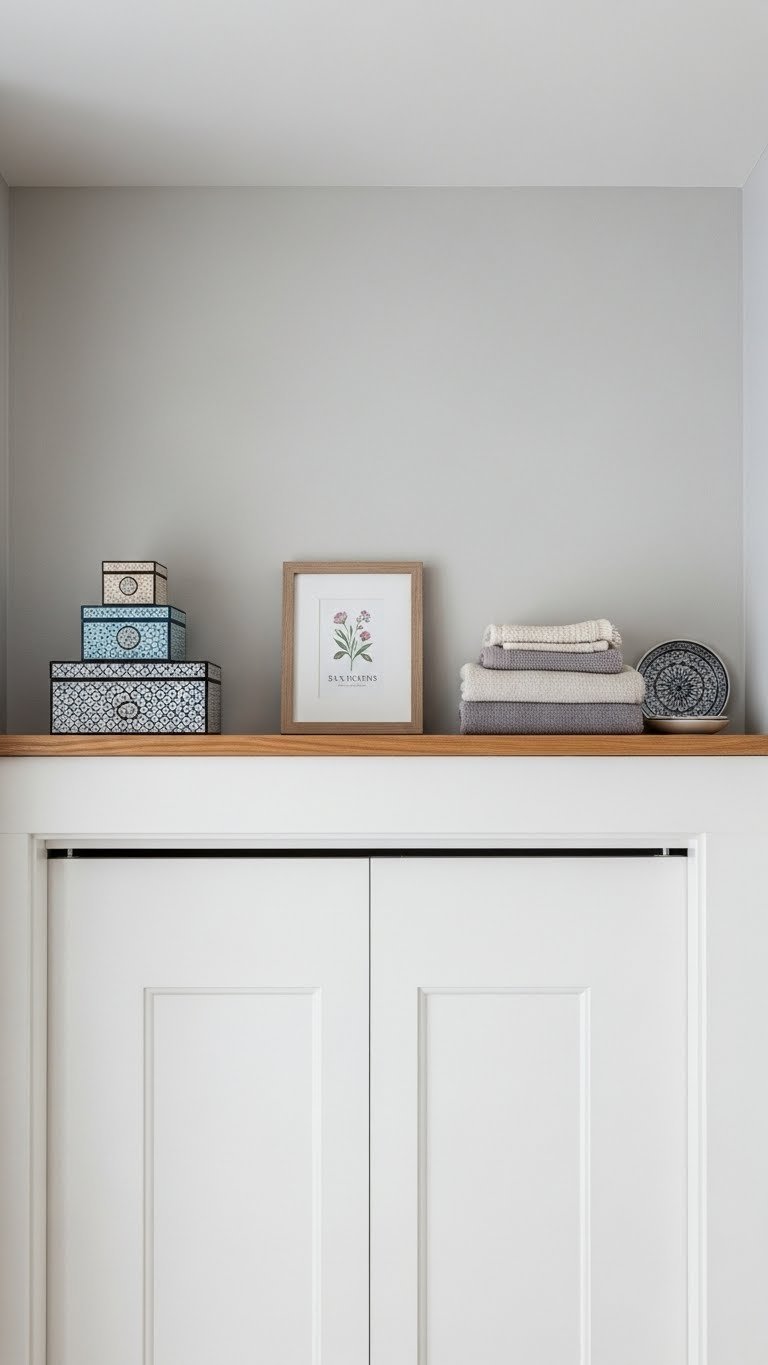 Measure the width and depth above your door, then mount a slim shelf ($15–$40) using heavy-duty brackets rated for the weight you’ll store. Ideal for off-season items, keepsakes, or decorative boxes—anything light enough to safely access. Takes 30 minutes with a drill and level. If you rent, a tension rod and hanging baskets ($20–$40) offer a similar effect without drilling.