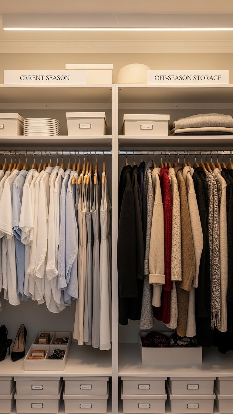 Install two hanging rods at the same height using the same bracket system ($30–$60 per rod from IKEA or Home Depot). One holds active-season items; the other holds off-season pieces. Swap them out every 3 months (takes 1 hour). Use the space below off-season rod for bins or baskets. Label each rod with removable tags ($5–$10). This costs minimal extra money and takes about 1 hour to set up.